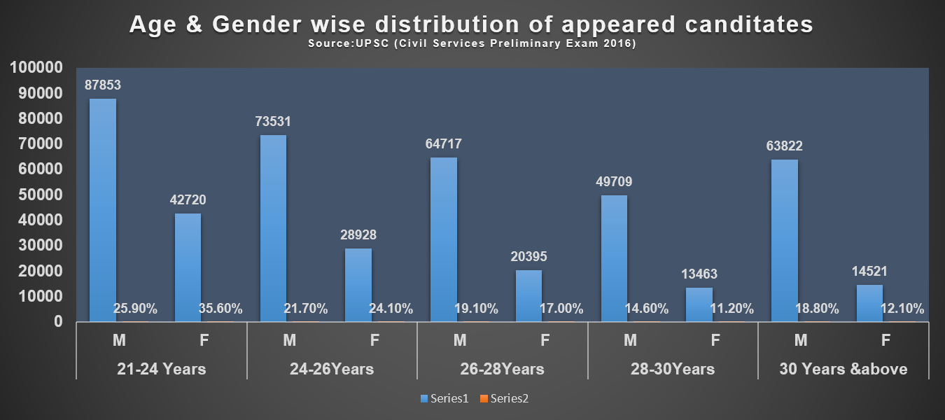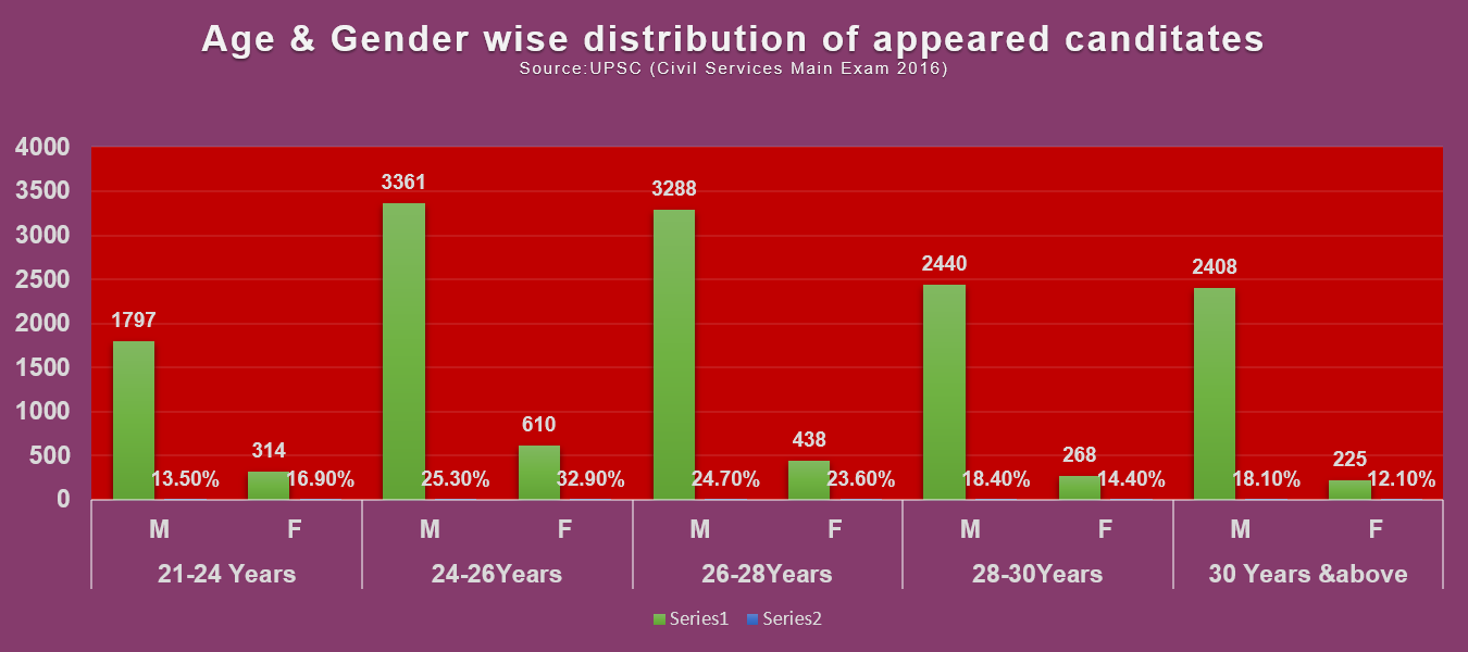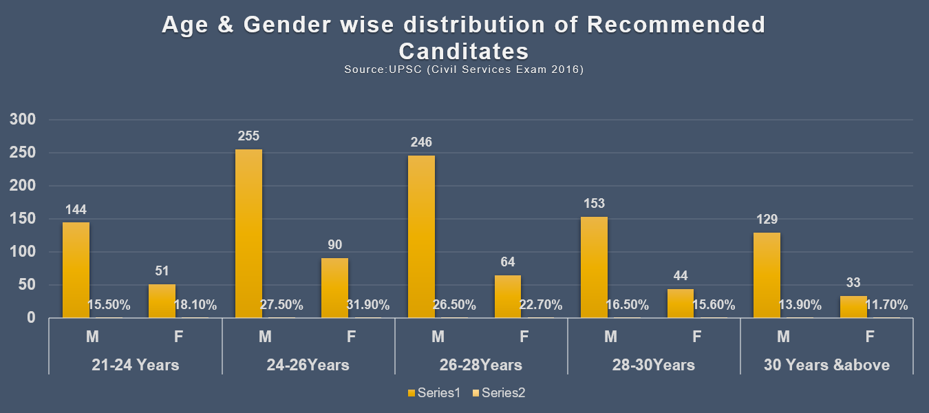 But, in Civil Services (Main) Examination 2016, maximum 25.3% male candidates appeared from the age group of 24-26 years. However, among the recommended candidates, the highest percentage (27.5%) of males recommended, were also from the age group of 24-26 years.